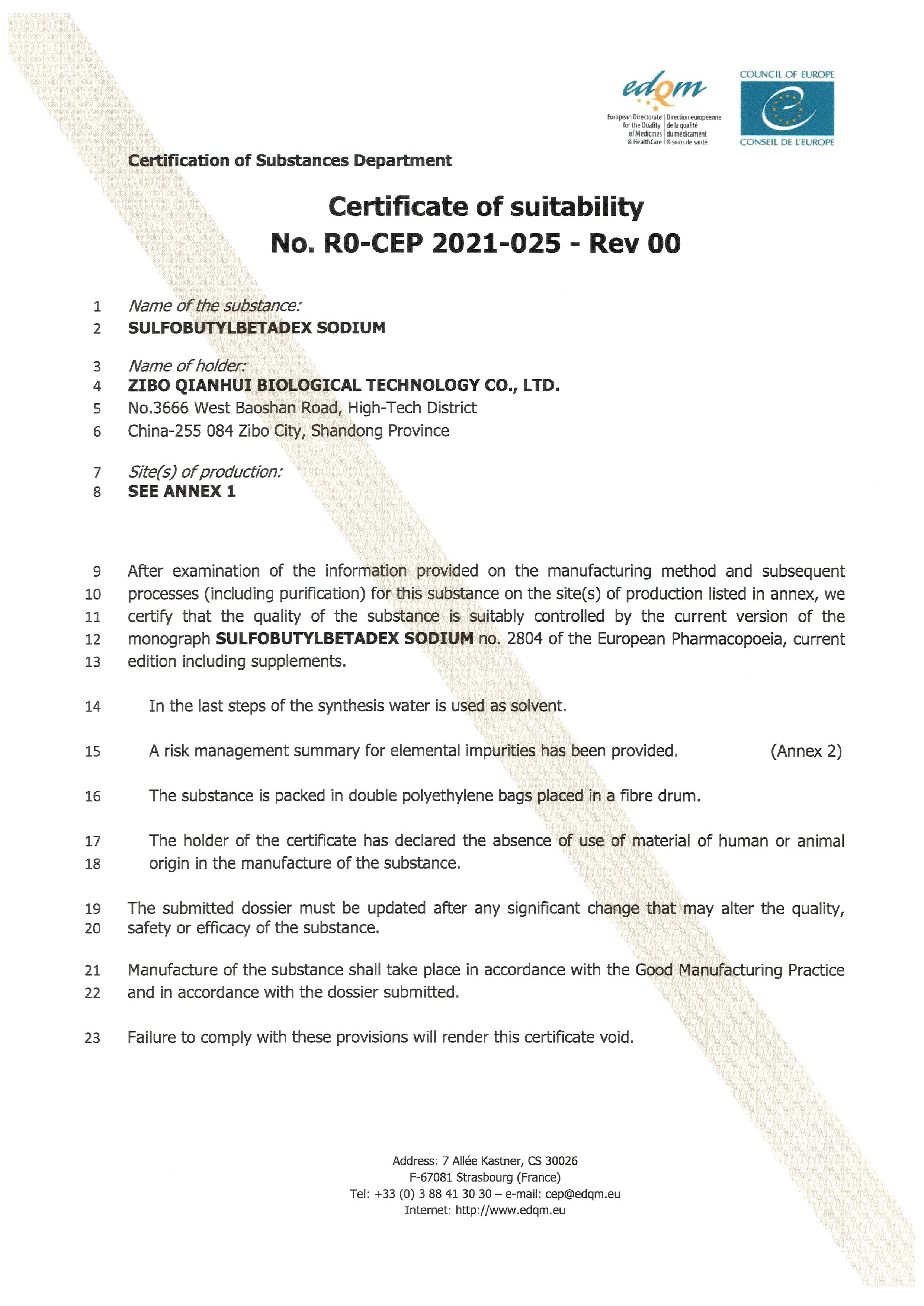 Developed new type injectable excipient Betadex Sulfobutyl Ether Sodium independently and filled the gap in domestic market, our Betadex Sulfobutyl Ether Sodium is the first one to pass the technical evaluation with related preparations (Registration status “A”). CDE registration No.: F20180000620, USA FDA DMF No.: 29394.